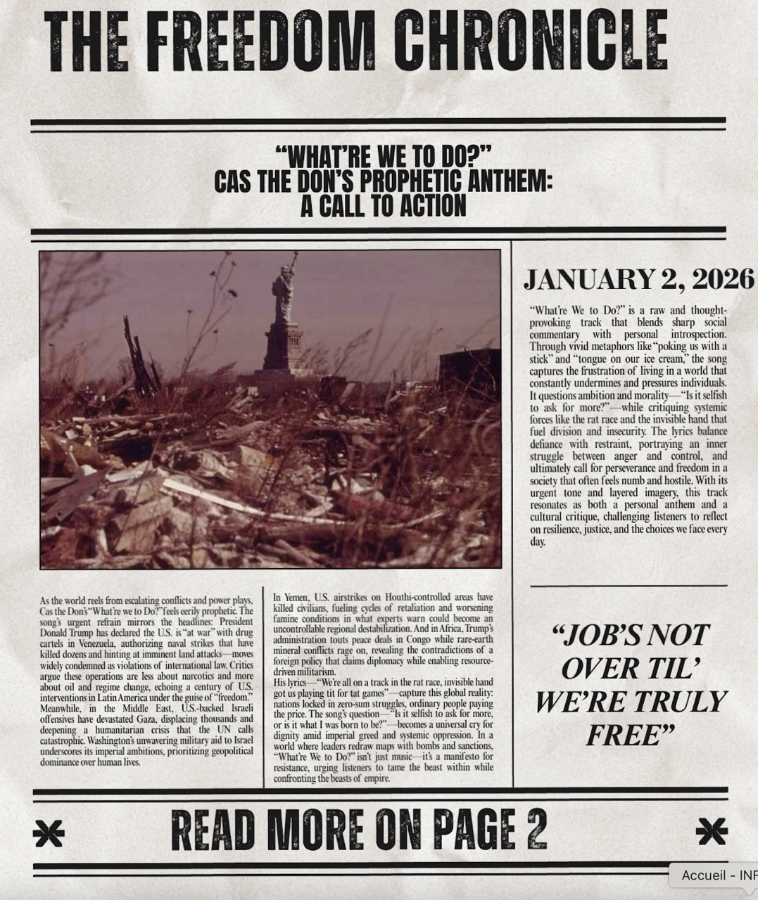 Avec What’re We to Do ?, Cas the Don affirme un peu plus sa place parmi les nouvelles voix du rap conscient américain. Originaire de New York, l’artiste propose un titre à la fois réfléchi et accessible, dans lequel il interroge les dilemmes sociaux, personnels et collectifs auxquels sa génération est confrontée. Encore au début de sa carrière, Cas the Don démontre déjà une maturité artistique remarquable. Après ses premières sorties sur SoundCloud en 2020, suivies de titres marquants comme I Know, Be Calm, Nobody Listening ou Heritage, l’artiste a su construire une audience fidèle grâce à une écriture sincère et engagée. What’re We to Do ? s’inscrit dans la continuité de projets tels que l’EP Inner Machinations of My Mind, où il explorait les luttes politiques, sociales et intérieures avec une grande lucidité. Sur le plan musical, la qualité instrumentale du morceau est un véritable point fort. La production est soignée, mêlant une base hip-hop moderne à des influences R&B subtiles, créant une atmosphère à la fois douce et mélancolique. Les arrangements laissent de l’espace à la voix, permettant au texte de s’imposer sans effort. Le flow, maîtrisé et nuancé, alterne entre intensité et retenue, renforçant l’impact émotionnel du message. Inspiré par des artistes comme Lauryn Hill, Cas the Don allie rap conscient et refrains accrocheurs, rendant son propos accessible sans jamais le simplifier. What’re We to Do ? apparaît ainsi comme une réflexion lucide sur le monde actuel, un morceau qui pousse à l’écoute attentive et à la remise en question. Avec ce single, Cas the Don confirme son évolution artistique et son engagement à utiliser la musique comme un espace de dialogue, de conscience et de vérité, annonçant un avenir prometteur sur la scène rap indépendante.